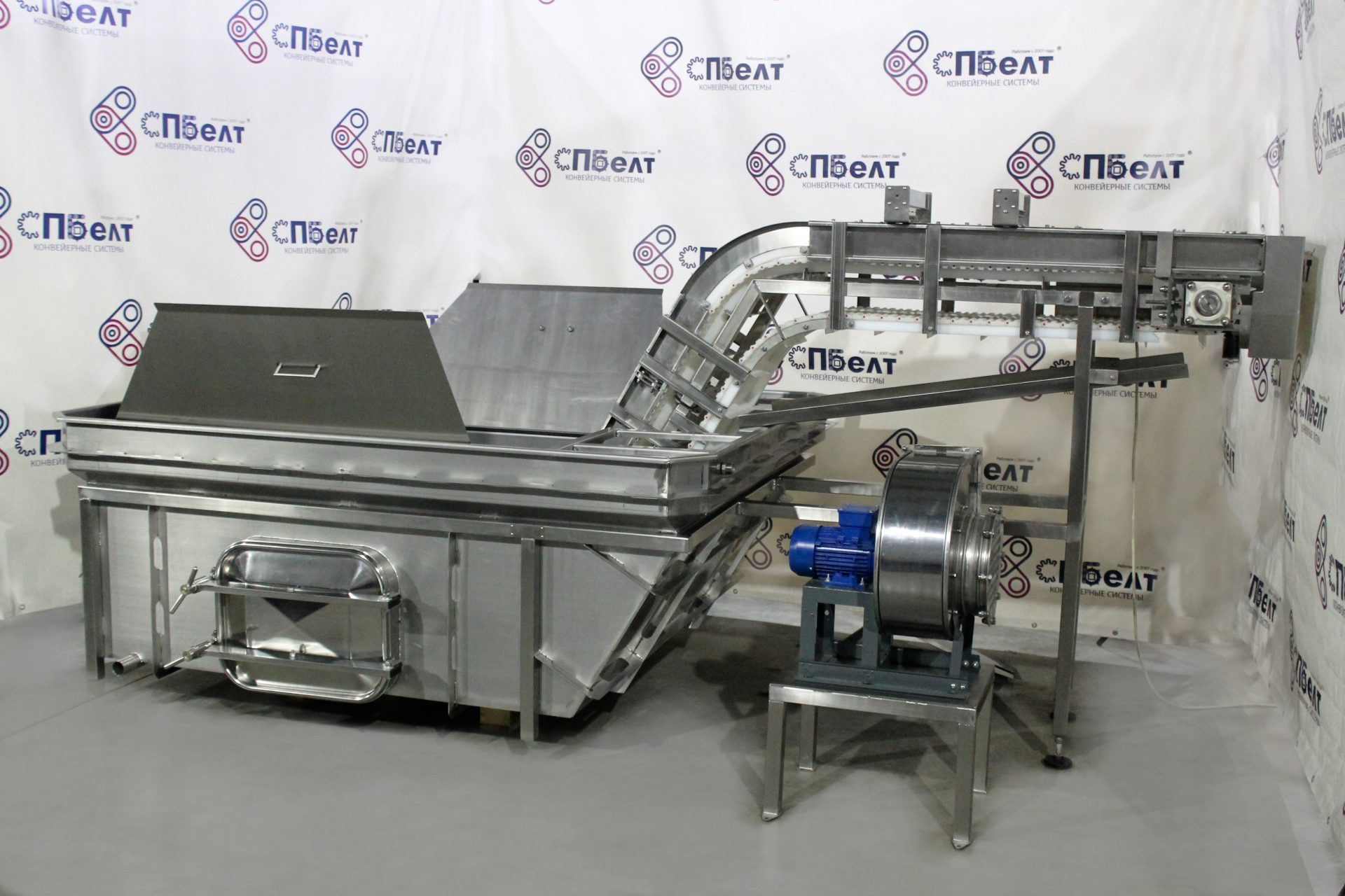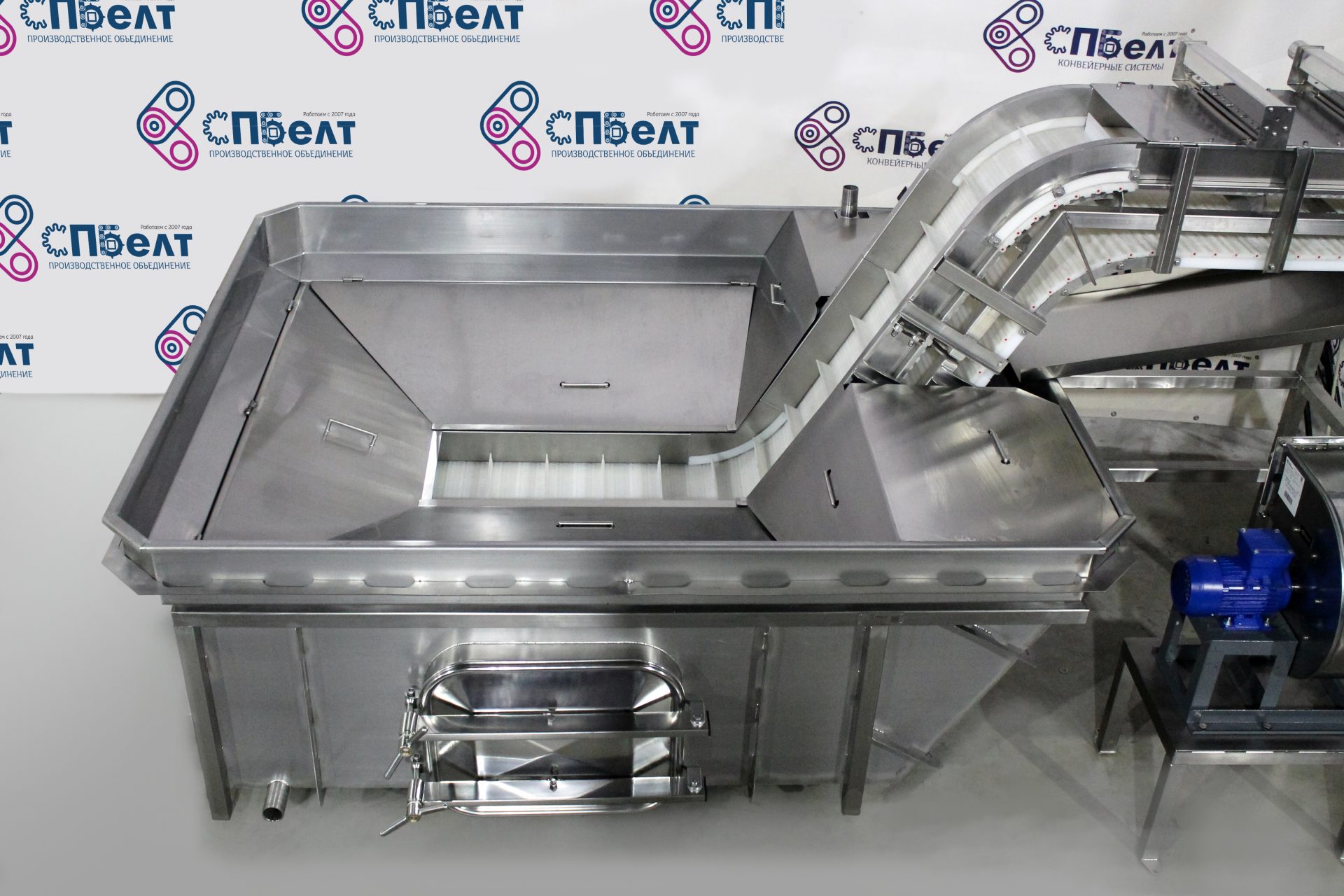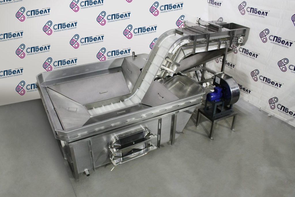 The storage tank has a built-in hatch in the lower part for easy washing and maintenance of the conveyor. The equipment is also equipped with two ball valves, the lower of which is for draining water, and the upper - for filling the tub with water.