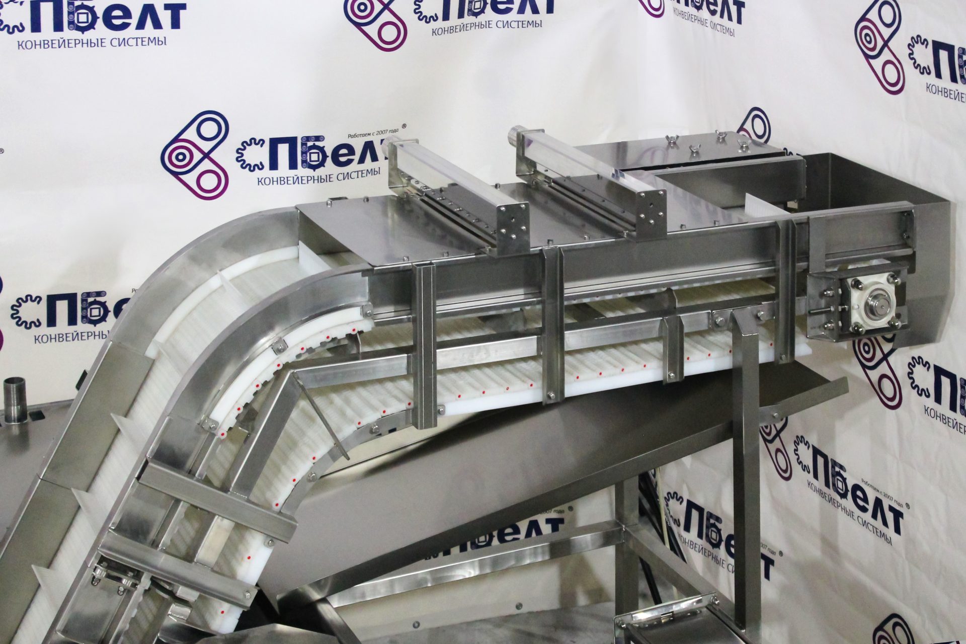 We have prepared a drawing of a storage tank with air knives according to the Customer's technical specification and manufactured a conveyor for it from SPBelt warehouse components. The ML 5010PE modular belt with flights for transportation of products at an incline was used.